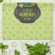 Kitchen Towel with an Illustration of a smiling leprechaun wearing a green suit, a bow-tie, and a bowler hat while sitting inside a pot o’ gold and holding a pint of beer, with yellow, green, and orange rainbow in the background. The image is placed over a seamless light green background with shamrocks.