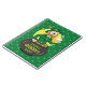 Notebook with an Illustration of a smiling leprechaun wearing a green suit, a bow-tie, and a bowler hat while sitting inside a pot o’ gold and holding a pint of beer, with yellow, green, and orange rainbow in the background. The image is placed over a seamless dark green background with shamrocks.