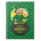 Cartoon leprechaun in a pot of gold holding a pint notebook