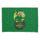 Pillow Case with an Illustration of a smiling leprechaun wearing a green suit, a bow-tie, and a bowler hat while sitting inside a pot o’ gold and holding a pint of beer, with yellow, green, and orange rainbow in the background. The image is placed over a seamless dark green background with shamrocks.