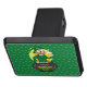 Hitch Cover with an Illustration of a smiling leprechaun wearing a green suit, a bow-tie, and a bowler hat while sitting inside a pot o’ gold and holding a pint of beer, with yellow, green, and orange rainbow in the background. The image is placed over a seamless dark green background with shamrocks.