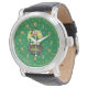 Watch with an Illustration of a smiling leprechaun wearing a green suit, a bow-tie, and a bowler hat while sitting inside a pot o’ gold and holding a pint of beer, with yellow, green, and orange rainbow in the background. The image is placed over a seamless dark green background with shamrocks.