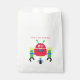 Cute birthday party favour bags with a colourful cartoon robot done in red, green, blue, and yellow. Personalize the dotted red text for your son's birthday. Matching invitations and party supplies are available.
