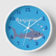 Une mignonne horloge murale bleue avec un grand requin blanc nageant. Idéal pour une chambre d'enfant, une salle d'enfant, une salle de jeux, une bibliothèque pour enfants ou une salle de classe préscolaire . Peut être personnalisé avec un nom. © ArianeC Illustrations-Tous droits réservés