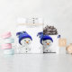 Adorable cartoon snowman with carrot nose and blue and white wool hat in staggered pattern.