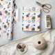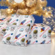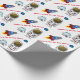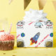 Cute space themed wrapping paper done in a white background, with colorful cartoon style graphics of a space ship, robot, astronaut and the planet earth in the background. Personalize the red text running diagonally for the birthday boy.