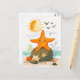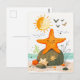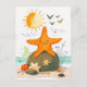 Cartoon starfish resting on a rock near the ocean, surrounded by marine plants and small fish.