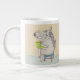 Cartoon warthog sitting daintily on a small blue cushioned stool. She is staring wistfully into the distance. In her "hand" is a beautiful light green cup and saucer. The cup is accented by a dark green handle with tangerine orange on the inside of the cup.