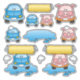 Car wash set. Brush, water splash, blue cartoon car, pig car and soap bubbles.