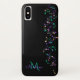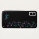 Cascading Music Notes Monogram  iPhone X  Case. Hanging strands of musical notes in violet pink gold and teal green on black or your choice of background colour.  Fill in your name and initial at the prompt to personalize and customize anyway you like.  A great gift for your favourite musician or music lover.