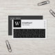 A business card template with a long rectangular image/photo area with a close-up photo of typewriter type leavers which alternatively can be replaced with your own image or photo and with a panel in the top left for a monogram or logo which includes a "W" as an example monogram which can also be changed. The design is balanced with four small rectangular text based symbols on the right created with the Semaphore symbol font. The white area is also a frame mask making it easy to position and resize a photo underneath. Company name and business type/quote on the front with name and contact details on the back in white on a contrasting dark grey background. Can be adapted to a variety of businesses and other uses.