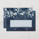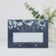 A navy wedding RSVP enclosure card featuring a navy blue watercolor painted background with watercolor painted florals in navy and dusty blue, stating RSVP in large upper case serif letters with your reply by date underneath and a large light grey area for guests to write their names with a box asking for the number of guests to be written asking to joyfully accept or regretfully decline. Your names and numerical date are written on the back of this RSVP enclosure card.
