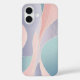 This is a captivating abstract artwork characterized by its soft, flowing lines and harmonious blend of pastel colours. The composition features organic, undulating shapes that gracefully interlock and overlap, creating a sense of gentle movement and fluidity. The primary colours include delicate blush pinks, serene sky blues, and soothing lavender purples, with subtle hints of mint green and cream. Fine, delicate white lines weave across and within some of the larger coloured sections, adding intricate detail and visual texture without disrupting the overall minimalist aesthetic. The overall impression is one of calm, elegance, and modern artistry, making it an ideal design for an iPhone case.