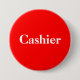 This pin back button has a red background with the word "Cashier". Perfect for business use or for garage sale, yard sales, or fundraisers. This button can be personalized with a name also.