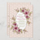 This fawn-coloured background, with white polka dots, has an oval panel adorned with fantasy flowers and foliage. Featured as a confirmation invitation, it is well-suited for any feminine celebration.