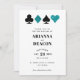 Faire-part de mariage pour le couple moderne, cette invitation présente une typographie simple et propre avec une touche moderne et un graphique brillant de casino à thème de parties scintillant turquoise et de cartes blanches, ce qui en fait le choix parfait pour une affaire somptueuse de Las Vegas.
