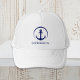 Casquette moderne sur le thème nautique avec une illustration bleu marine d'une ancre dans un cercle et le nom de votre bateau en simple typographie.
