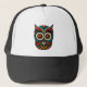Il s'agit d'une chouette décorative faite à la main et stylisée avec des motifs aztèques aux couleurs noir, rouge, turquoise et orange.