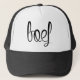 This Boef (= dutch meaning of rebel or rebellious) trucker cap is black by colour and has a brim.