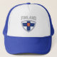 Le drapeau national de Finlande est infusé dans une forme de bouclier qui a des contours bleus et blancs dans les couleurs du drapeau. Le nom du pays est ajouté au-dessus de l'image.