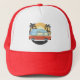 Design cool avec une illustration de camionnette rouge et bleu sur les palmiers et la silhouette solaire sur un cadre circulaire.