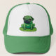 Carlin vert mignon ressemblant à une grenouille assise sur un lilipad. La couleur Arrière - plan peut être modifiée.
