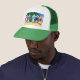 Un casquette de style camionneur vert et blanc, décoré d'un collage en papier peint à la main de cabanes de plage.
