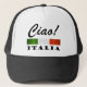 Montrez votre fierté italienne et dites Ciao (bouffe prononcée). La salutation est appropriée pour des personnes que vous connaissez. Tout en visitant l'Italie, le mot plus poli "onguent" (sahl-vey) sera bien reçu par les Italiens indigènes. Caractéristiques de conception le mot "Ciao !" au-dessus d'un vert affligé de tricolore, un blanc, et une bannière italienne rouge de drapeau, et le mot "Italie." Célébrez votre amour pour l'Italie, le 5ème pays le plus visité au monde. Le casquette pratique de camionneur fait un grand cadeau pour n'importe qui qui aime Bella Italie. Cette conception de drapeau de l'Italie convient aux milieux blancs et de couleur claire.