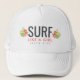 Costa Rica chapeau de camionneur souvenir imprimé avec "Surf comme une fille" en texte rose et gris fusain avec le design fleur Hibiscus pour les filles surfeurs et les femmes surfeurs.