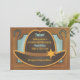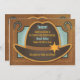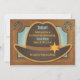 Une adorable invitation baby shower qui a un casquette mignon avec une star du shérif occidental au sommet. Les coins ont un fer à cheval et les fer à cheval ont de mignons points bleus. L'invitation a une grande texture occidentale qui donne l'effet du bois.