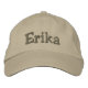 Votre nom brodé sur un casquette de baseball / casquette de baseball kaki tan. Le texte est entièrement personnalisable. On voit le nom modifiable, Erika. Conçu par 369MyName.