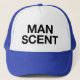 ÉQUIPEZ le slogan d'amusement de PARFUM sur le casquette de camionneur, type noir sur le casquette de bleu royal - juste comme dans l'épisode de série, typographie audacieuse, déclaration d'amusement, inspirée par rossitano de contreseing de caractère de TV.