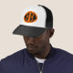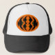 Ce casquette éffrayant d'Halloween présente un ovale orange avec six corbeaux. Chaque corbeau a des yeux jaunes avec des élèves noirs et des ailes étirées. Les corbeaux volent vers l'autre formant une forme ovale.