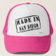 Fait à San Diego ! Êtes-vous de San Diego, la Californie ? Avez-vous un ami ou un membre de la famille qui aiment San Diego, la Californie ? Si oui, ceci "a fait dans…" le casquette est exactement le cadeau que vous recherchez ! Les caractéristiques de conception qu'un patiné "fait à San Diego" dans le noir pochoir-comme le lettrage a entourées par un rectangle arrondi par noir.