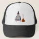 Ce casquette impressionnant présente une image art numérique d'une mignonne sorcière de rat gris avec oreilles roses, nez, pieds et queue. Le rat porte un casquette pointu noir avec une boucle d'or et des étoiles violettes tout autour. Les rats portent aussi un manteau noir couvert d'étoiles violettes. A côté du rat, un balai brun fait de brindilles. Ce rat est habillé prêt pour une fête d'Halloween.