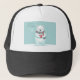 Trucker hat showing adorable polar bear in a scarf hugging a tiny wrapped gift, surrounded by falling snow and a friendly “Happy Holidays