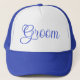 Casquette de baseball de style camionneur personnalisé en bleu royal et blanc avec le texte "Groom" en typographie de lettre en bleu royal et design graphique numérique par TheFabricSeal boutique d'impression à la demande sur Zazzle.com #ZazzleMade https://www.zazzle.com/store/thefabricseal TheFabricSeal©️Original.