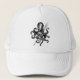 oeuvre en noir et blanc d'une pieuvre tenant un trident dans ses tentacules sur un chapeau de camionneur.