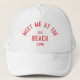 La casquette de camionneur Rendez-vous à la plage est le chapeau idéal pour votre voyage à la plage. Lettres de plage en détresse rouges. Personnalisez avec les détails de votre voyage à la plage... année et destination de la plage. Parfait pour un voyage à la plage en famille ou entre amis ou un enterrement de vie de jeune fille dans un club de plage ou comme souvenir d'un voyage passé. Accessoires assortis disponibles dans la collection Meet Me At The Beach Yellow Cabana Stripe.