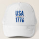 USA et 1776 dans une police unique est imprimé sur ce chapeau de camionneur unisexe surligné de rayures rouges et bleues et d'une étoile d'or. CORRESPONDRE des articles dans notre magasin.