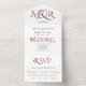 Elegant cassis purple initials with ampersand and white rose all in one wedding invitation. It features your initials and the ampersand in a decorative relief font in cassis purple, decorated with a white rose. The RSVP can be detached.