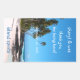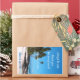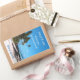 Large vertical, wine bottle sticker with a tropical island theme of palm trees, beach sand and blue water. Use the four areas of template text to customize with the bride's and groom's names, a short thank you message, wedding date and name of wine or spirits at the bottom. Place on wine, champagne or any bottle favour at the reception. Delete any of the example text to leave that area blank.