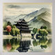 This serene watercolor-style painting features a majestic Japanese castle nestled beside a tranquil lake, surrounded by lush summer foliage. Soft green mountains rise in the background, while vibrant touches of red and gold hint at seasonal change. The castle’s elegant multi-tiered rooftops reflect beautifully in the still water below, creating a peaceful, immersive landscape. Perfect for lovers of Japanese architecture, nature scenes, and calming wall art.