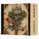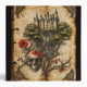 A page from a book of dark fairy tales features a castle, an eldritch tree, and a skull topped with red flowers. Illegible text on the background completes the design. Very Gothic design, and perfect for those who enjoy the darker side of fantasy.