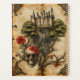 A page from a book of dark fairy tales features a castle, an eldritch tree, and a skull topped with red flowers. Illegible text on the background completes the design. Very Gothic design, and perfect for those who enjoy the darker side of fantasy.