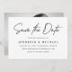 Simple save the date card featuring "Save the Date" in a black handwritten script with a white background. Personalize the modern save the date card by adding your names, wedding date, wedding location, wedding website, etc. The minimalist save the date card reverses to display your favourite horizontal engagement photo.