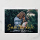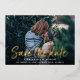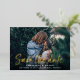A modern save the date card featuring "save the date" in a fresh and casual handwritten typography style that evokes the look of a brush marker. Designed to accommodate your favourite horizontal or landscape oriented full-bleed engagement photo, this chic card features a white text overlay with your names, wedding date and wedding location, and "save the date" in gold foil lettering. Cards reverse to a subtle ikat pattern with space to include your wedding website url or any additional information you choose.