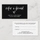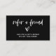 These stylish and chic black "refer a friend" small business referral cards cards feature white casual, modern script typography, along with an elegant matching heart. A look that is both stylish and professional, and perfect for any type of occupation, such as content creator, makeup artist, hair salon stylist, and more. The back contains plenty of room for you to totally customize with your store or company information.
