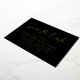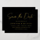 Simple save the date card featuring "Save the Date" in a handwritten gold foil script with a black background. Personalize the modern save the date card by adding your names, wedding date, wedding location, wedding website, etc. The minimalist save the date card reverses to display a solid black background or colour of your choice.