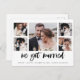 This simple, black and white wedding announcement postcard features modern, casual script typography that says "we got married", with a multi photo grid of five photos. A stylish way to let friends and family know about your elopement or micro wedding or small wedding.